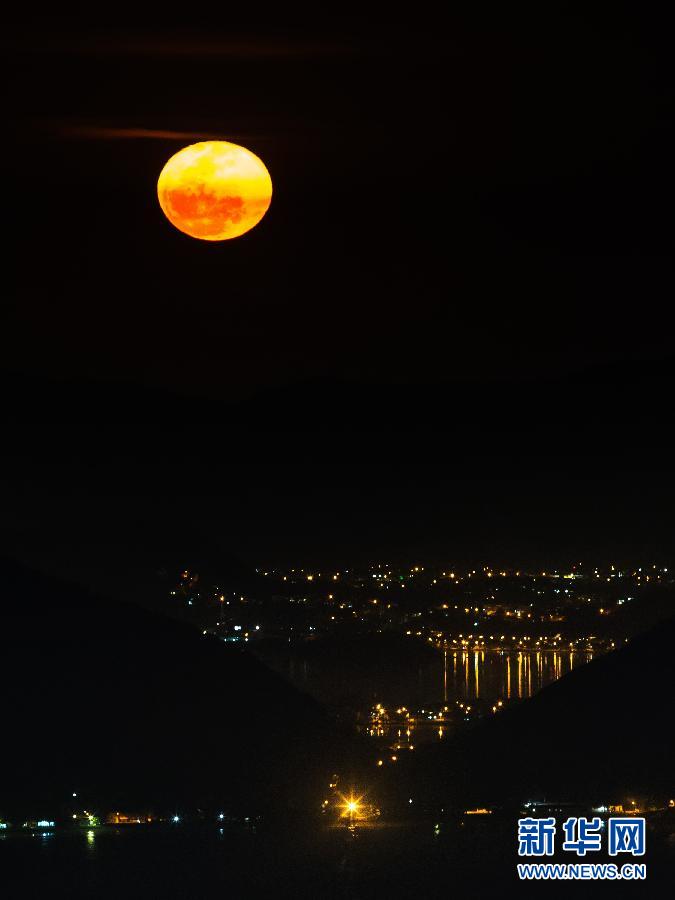 8月30日,在巴西里约热内卢,一轮圆月从瓜纳巴拉湾上升起。新华社记者徐子鉴摄