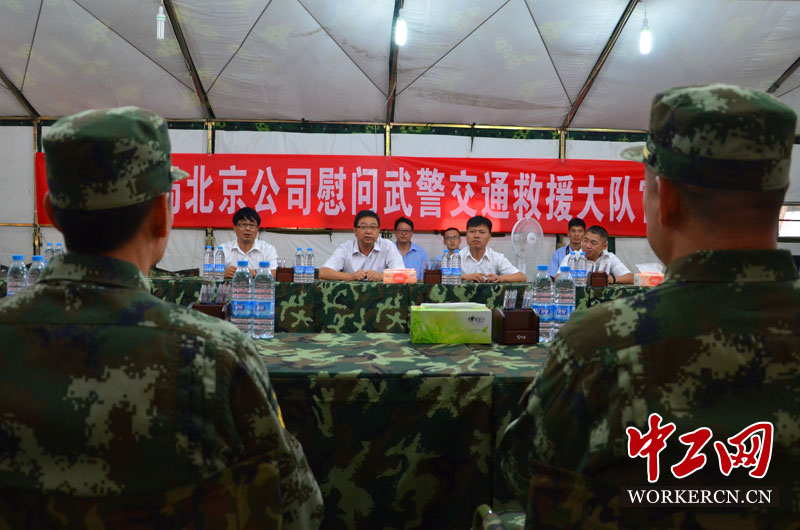 中建一局北京公司慰问驰援天津的武警交通救援大队。    中工网记者 秦笑语摄