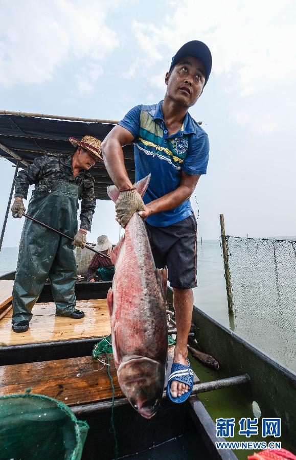 9月1日,幻溇村的一名渔民在展示一条40多斤重的鲢鱼。 新华社记者 徐昱 摄