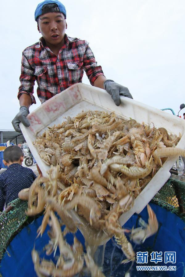 9月1日,在山东烟台芝罘岛东口渔港,渔民将捕获的爬虾装桶。 新华社发(唐克摄)