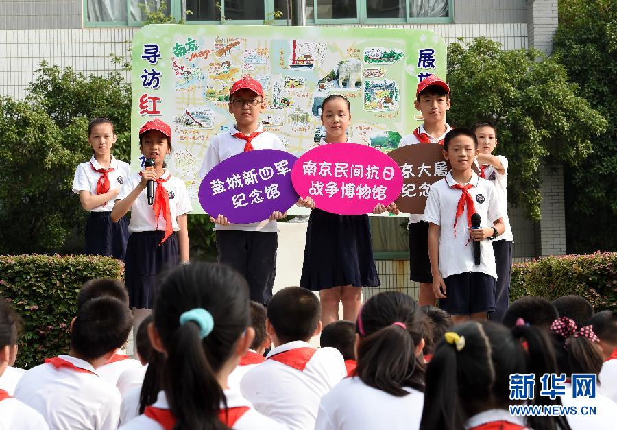 9月1日,南京师范大学附属小学学生(左二)在开学典礼上介绍暑期寻访抗战历史的收获。