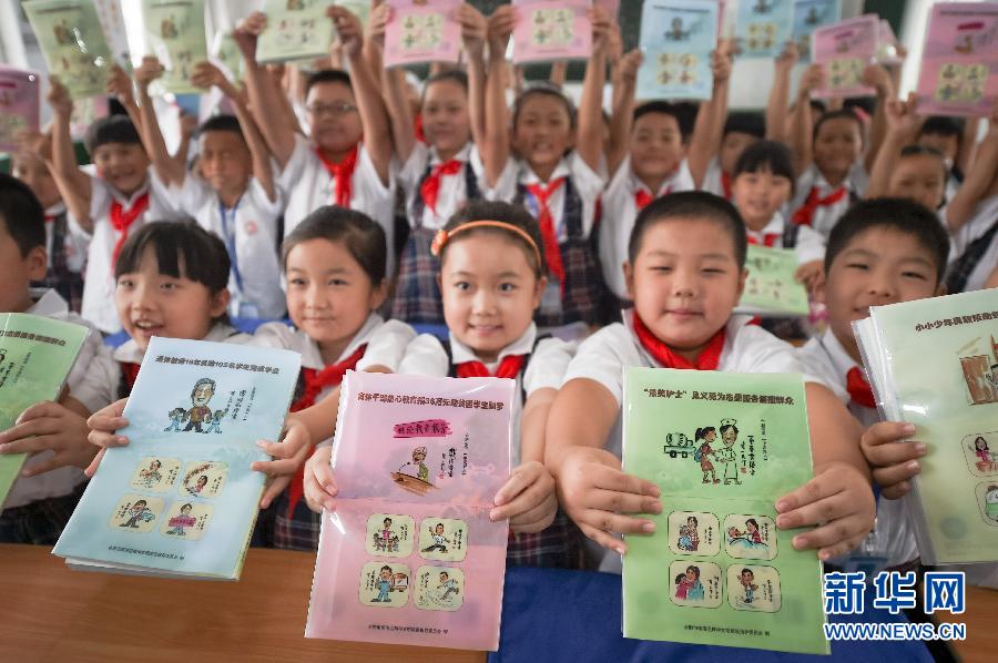 9月1日,安徽合肥市瑶海区隆岗小学学生展示印有“中国好人”先进事迹的漫画书皮。