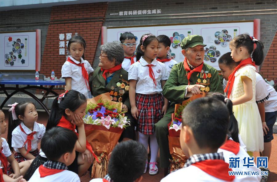 9月1日,老兵马维忠(右)、董肯在江西南昌市东湖区百花洲小学开学典礼上向孩子们讲述抗战故事。