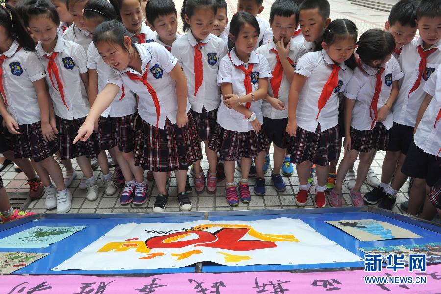 9月1日,浙江省临安市博世凯小学学生参观纪念抗战胜利70周年绘画展。当日是新学期开学第一天,浙江省临安市博世凯小学举行“铭记历史、珍惜和平”主题教育活动,通过观看抗战绘画作品、和平鸽剪纸等方式,让学生们铭记历史。新华社发(胡剑欢 摄)