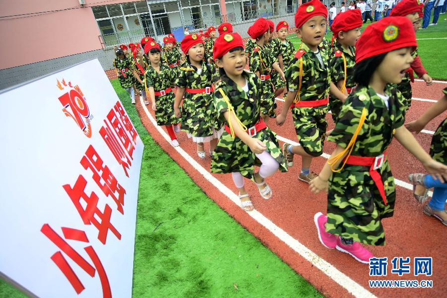9月1日,在济南市经八路小学,一年级新生进行“阅兵”表演。当日是济南中小学开学首日,结合纪念抗战胜利70周年,经八路小学举行“小阅兵”主题开学典礼,为祖国点赞。 新华社发(赵晓明 摄)