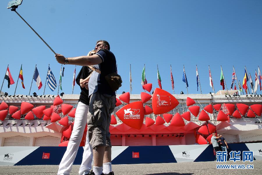 9月1日,人们在意大利威尼斯利多岛电影宫前拍照。第72届威尼斯电影节将于2日傍晚在意大利威尼斯利多岛正式开幕。威尼斯电影节诞生于1932年,是世界上第一个电影节。今年的举办时间是9月2日至12日。新华社记者金宇摄