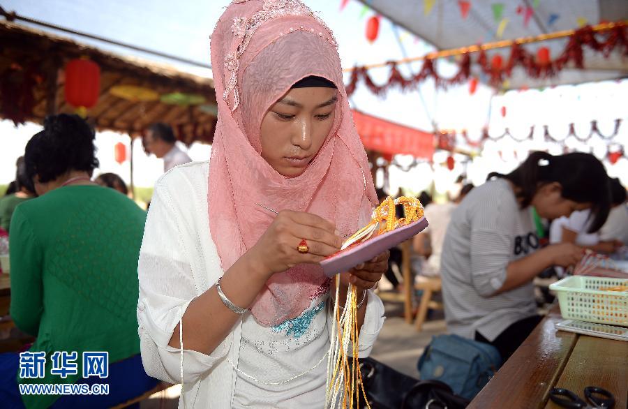 在银川市西夏区华西社区农夫乐园,参赛者在进行串珠编织比赛(9月1日摄)。 9月1日,宁夏银川市西夏区工会在镇北堡华西社区农夫乐园举办百人手工编织技能大赛,100名职工参加了串珠编织和线绳编织两项比赛,各具特色的编织作品令前来观看的居民大开眼界。据了解,截至目前,银川市西夏区各级工会共开展电焊、剪纸、礼仪等各类技能竞赛和岗位大练兵36场次,参与职工近2万人。 新华社记者 王鹏摄