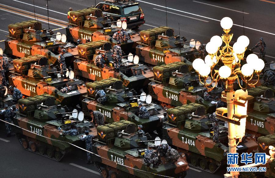 9月3日,中国人民抗日战争暨世界反法西斯战争胜利70周年纪念大会将在北京隆重举行。这是空降兵战车方队在做准备。 新华社记者 赵颖全 摄