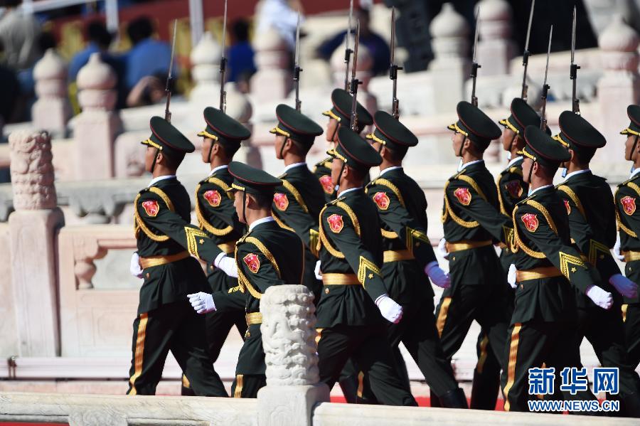 9月3日,中国人民抗日战争暨世界反法西斯战争胜利70周年纪念大会将在北京隆重举行。这是标兵走过金水桥。 新华社记者吴晓凌摄