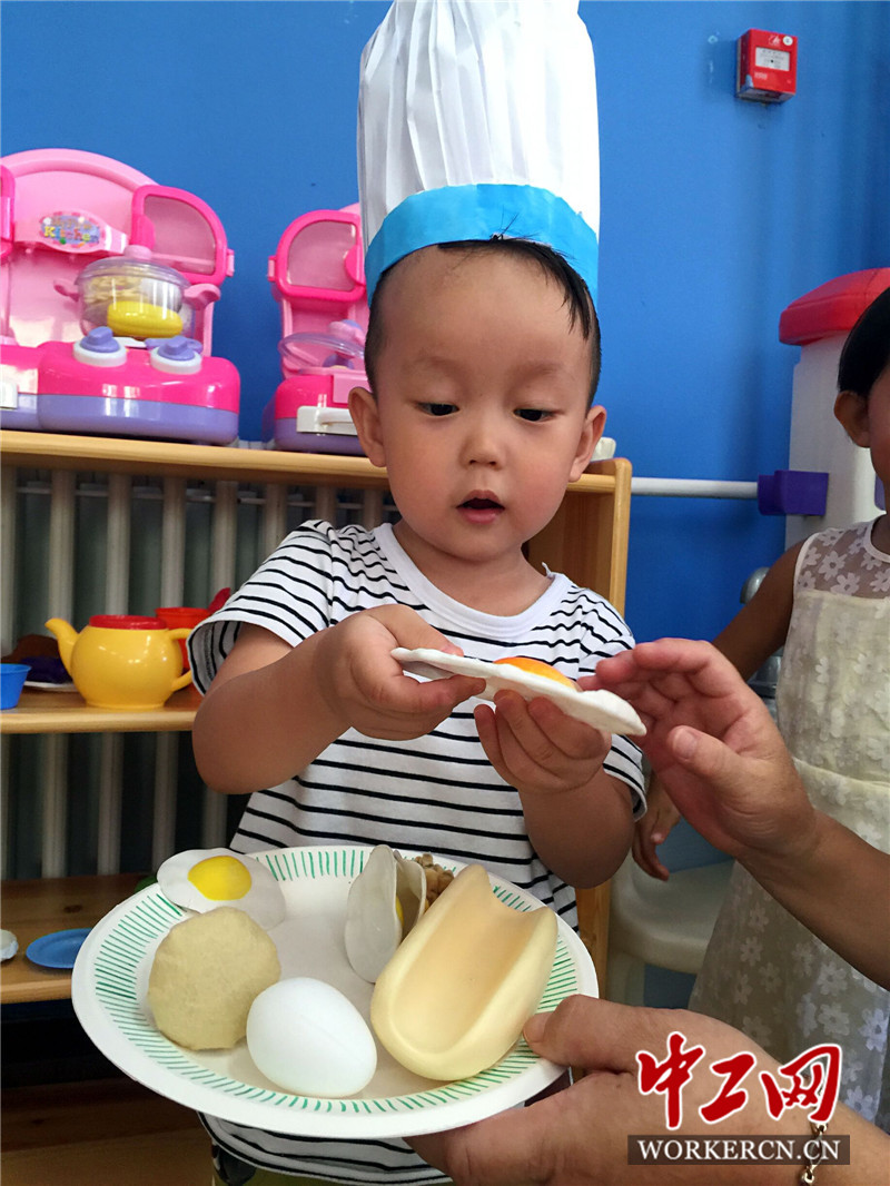 幼儿园里有很多小朋友和玩具,小诺第一次尝试“角色扮演”,cosplay一名大厨。各种精致的食物模型深受孩子喜欢。 中工网记者 秦笑语摄