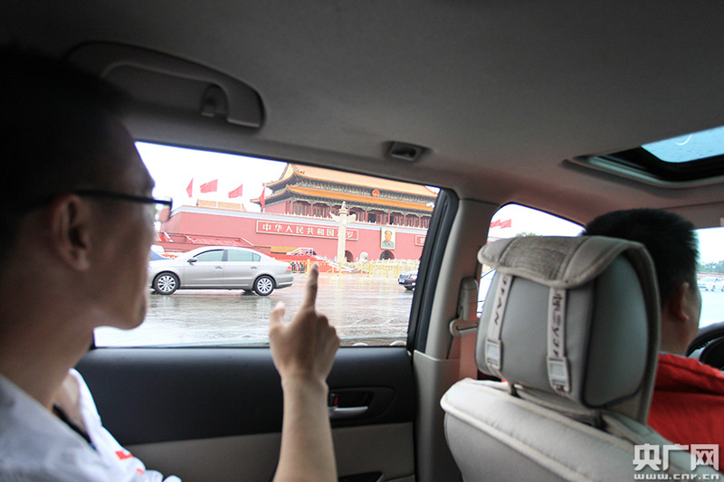 在去火车站的路上汽车经过天安门广场,王进抑制不住兴奋,用手指着自己观看阅兵时的座位。(央广网记者 韩靖摄)