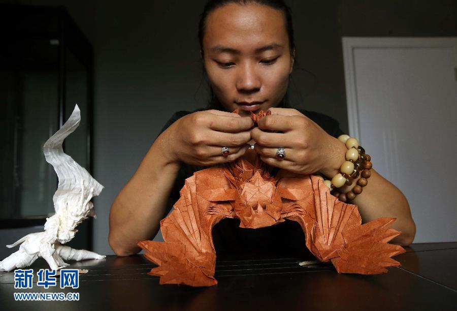 9月6日,秦坤在用纸折“猫头鹰”作品。广西桂林市90后小伙秦坤,从小爱好折纸。2003年开始专心从事折纸,并师从法国一名折纸大师。秦坤擅长折各类结构复杂动物和人物,作品惟妙惟肖,令人叹为观止。新华社发(刘教清 摄)