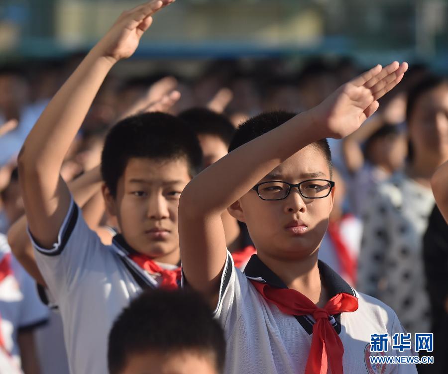 9月7日,北京市广渠门中学的学生在开学仪式上敬少先队队礼。当日,北京市中小学正式开学。 新华社记者 李文 摄