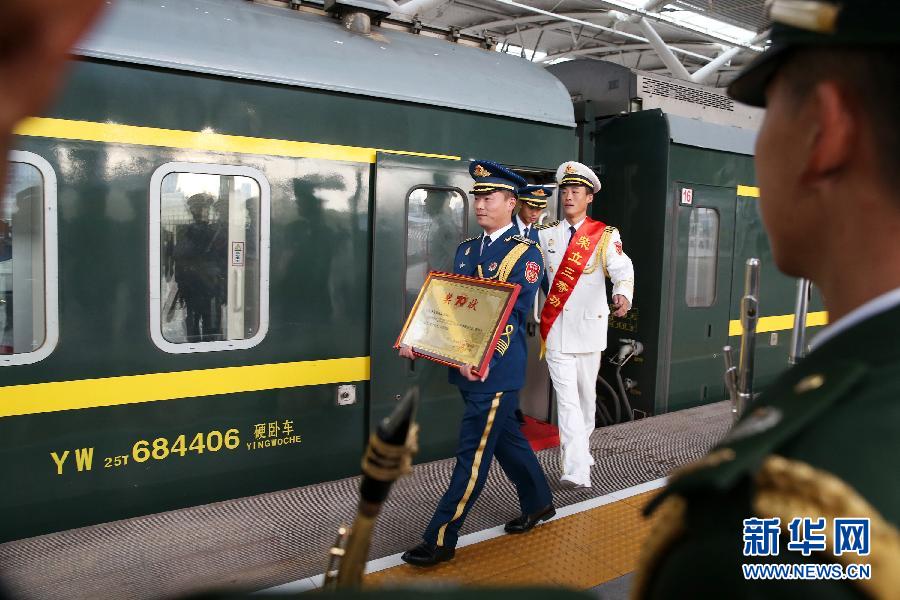 9月7日,军乐队队员走下火车。当日,武警宁夏总队军乐队赴京参加中国人民抗日战争暨世界反法西斯战争胜利70周年纪念大会的10名官兵载誉归来。据了解,武警宁夏总队军乐队的这10名战士在经过百余日的艰苦集训后,圆满完成了9月3日阅兵现场吹奏任务,军乐队集体被评为先进单位。新华社发(周焕成 摄)