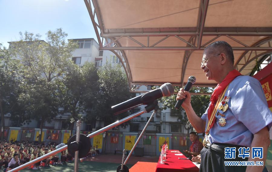 9月7日,在体育馆路小学的开学典礼上,90岁的老战士丁仲华为学生讲述过往的故事。当日,北京市中小学正式开学。东城区各学校的开学第一课以“勿忘国耻、圆梦中华”为主题,激励学生凝聚爱国情怀、树立远大志向。 新华社记者李文 摄