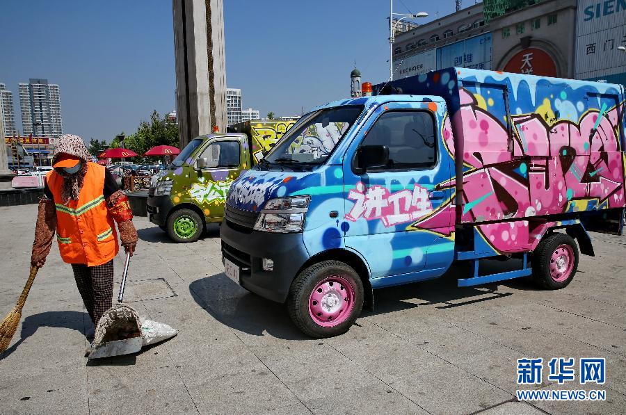 9月7日,在秦皇岛市一商业区内,环卫工人在涂鸦垃圾运送车旁清扫垃圾。近日,以“讲卫生、爱环境、守公德、最文明”为主题的卡通画涂鸦袋装化垃圾车亮相河北省秦皇岛市海港区,倡导人们关注环境。新华社记者杨世尧摄