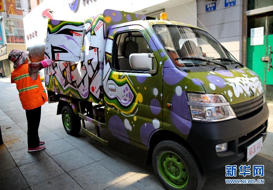 9月7日,在秦皇岛市一商业区内,环卫工人将垃圾倒入涂鸦垃圾运送车内。近日,以“讲卫生、爱环境、守公德、最文明”为主题的卡通画涂鸦袋装化垃圾车亮相河北省秦皇岛市海港区,倡导人们关注环境。新华社记者杨世尧摄