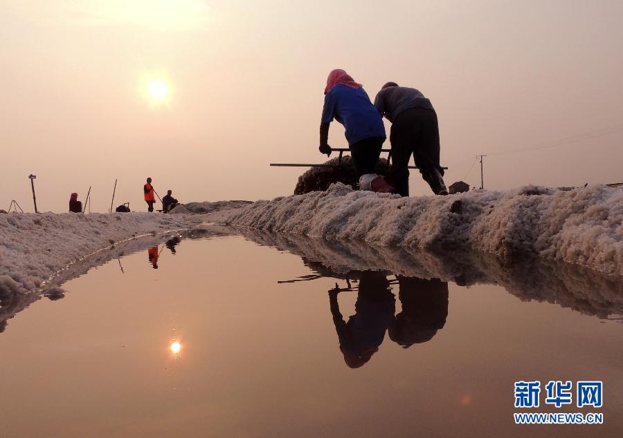 9月10日,连云港台北盐场工人在进行扒盐作业。当日起,江苏连云港境内50万亩原盐全面进入“秋扒”作业,工人们加紧收获原盐。淮北盐场系我国四大海盐产区之一,也是最古老的原盐产区之一,淮盐有4000余年历史。新华社发(耿玉和 摄)