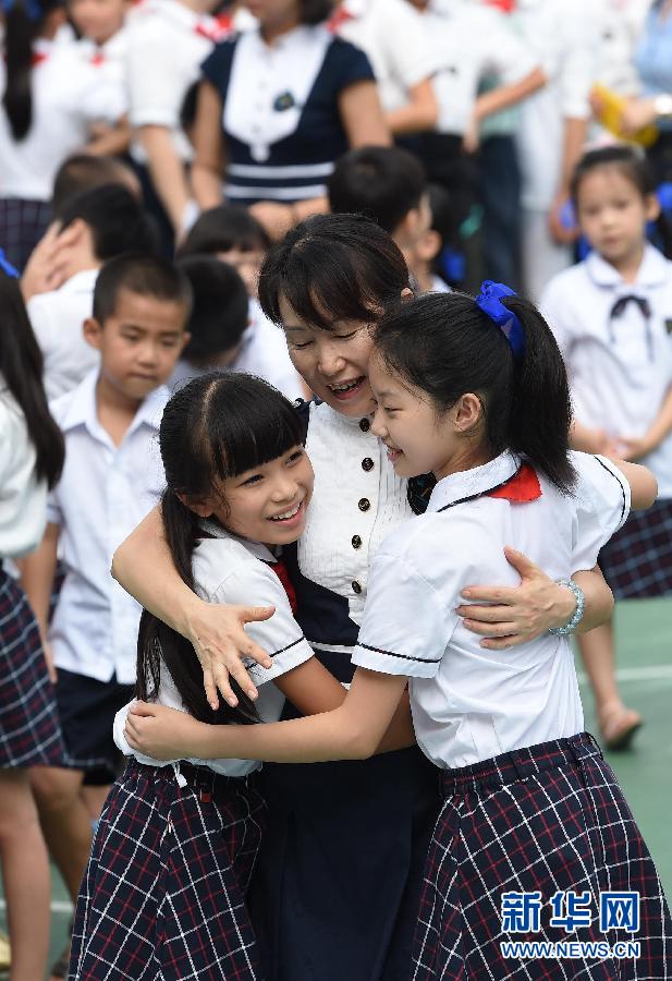 9月10日,在广西南宁市滨湖路小学,老师和学生拥抱庆祝教师节暨“爱生日”。当日,广西南宁市滨湖路小学举行第31个教师节暨第10个“爱生日”活动,全校师生相互拥抱,校园里充满了老师对学生的爱以及学生对老师的感恩之情。新华社记者 黄孝邦 摄