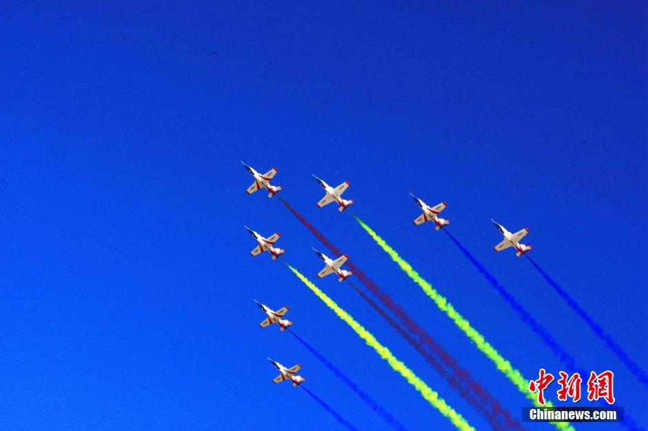 9月10日,空军组织的航空开放活动中,飞行表演备受瞩目。此次飞行表演由三支飞行表演队参加。其中,空军八一飞行表演队、“天之翼”飞行表演队部分队员刚圆满完成纪念抗战胜利70周年阅兵任务归建。图为“红鹰”表演队八架飞机似离弦之箭直刺苍穹。中新社发 刘成 摄