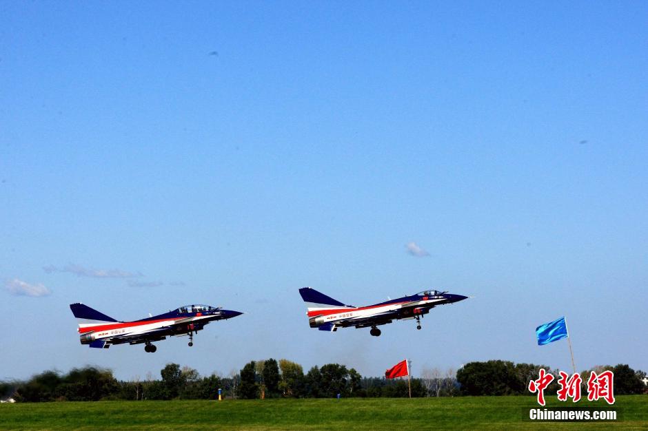 9月10日,空军组织的航空开放活动中,飞行表演备受瞩目。此次飞行表演由三支飞行表演队参加。其中,空军八一飞行表演队、“天之翼”飞行表演队部分队员刚圆满完成纪念抗战胜利70周年阅兵任务归建。图为“八一”飞行表演队2机编队起飞。中新社发 刘成 摄