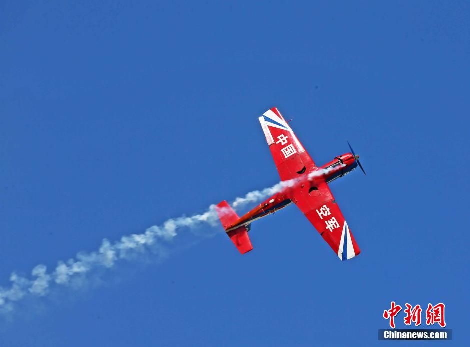 9月10日,空军组织的航空开放活动中,飞行表演备受瞩目。此次飞行表演由三支飞行表演队参加。其中,空军八一飞行表演队、“天之翼”飞行表演队部分队员刚圆满完成纪念抗战胜利70周年阅兵任务归建。图为“天之翼”表演队在做单机横滚的动作。中新社发 谭超 摄