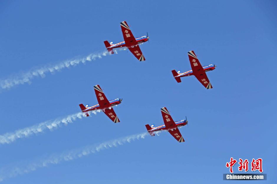 9月10日,空军组织的航空开放活动中,飞行表演备受瞩目。此次飞行表演由三支飞行表演队参加。其中,空军八一飞行表演队、“天之翼”飞行表演队部分队员刚圆满完成纪念抗战胜利70周年阅兵任务归建。图为“天之翼”表演队四机编队成“斜平面”飞行。中新社发 谭超 摄