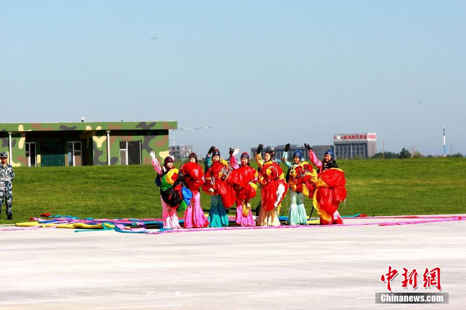 9月10日,空军组织的航空开放活动中,飞行表演备受瞩目。此次飞行表演由三支飞行表演队参加。其中,空军八一飞行表演队、“天之翼”飞行表演队部分队员刚圆满完成纪念抗战胜利70周年阅兵任务归建。图为“八一”跳伞表演队队员完成表演后向观众挥手致意。中新社发 刘成 摄