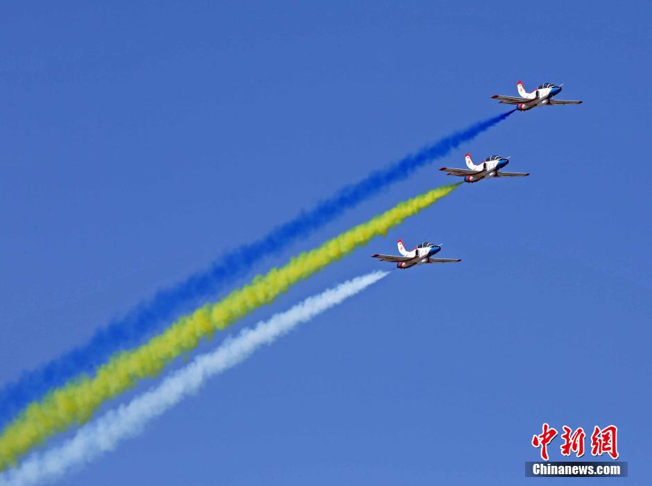 9月10日,空军组织的航空开放活动中,飞行表演备受瞩目。此次飞行表演由三支飞行表演队参加。其中,空军八一飞行表演队、“天之翼”飞行表演队部分队员刚圆满完成纪念抗战胜利70周年阅兵任务归建。图为“红鹰”表演队进行三机纵队叠罗汉表演。中新社发 谭超 摄