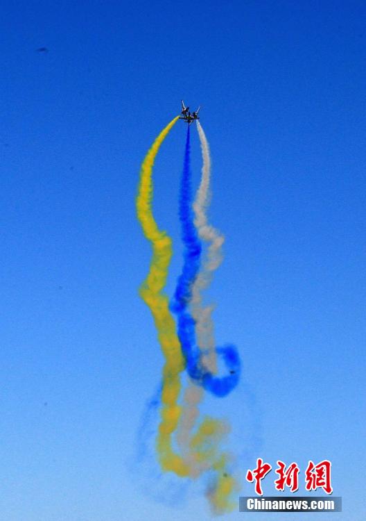 9月10日,空军组织的航空开放活动中,飞行表演备受瞩目。此次飞行表演由三支飞行表演队参加。其中,空军八一飞行表演队、“天之翼”飞行表演队部分队员刚圆满完成纪念抗战胜利70周年阅兵任务归建。图为“红鹰”表演队三架飞机在蓝天中描绘出美丽的弧线。中新社发 刘成 摄