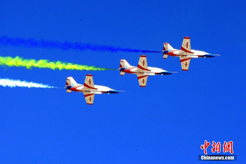 9月10日,空军组织的航空开放活动中,飞行表演备受瞩目。此次飞行表演由三支飞行表演队参加。其中,空军八一飞行表演队、“天之翼”飞行表演队部分队员刚圆满完成纪念抗战胜利70周年阅兵任务归建。图为“红鹰”表演队进行三机纵队叠罗汉表演。中新社发 刘成 摄