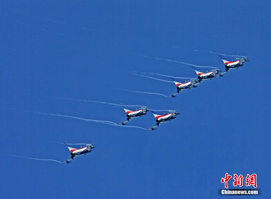 9月10日,空军组织的航空开放活动中,飞行表演备受瞩目。此次飞行表演由三支飞行表演队参加。其中,空军八一飞行表演队、“天之翼”飞行表演队部分队员刚圆满完成纪念抗战胜利70周年阅兵任务归建。图为“八一”飞行表演队六机编队飞行。中新社发 谭超 摄
