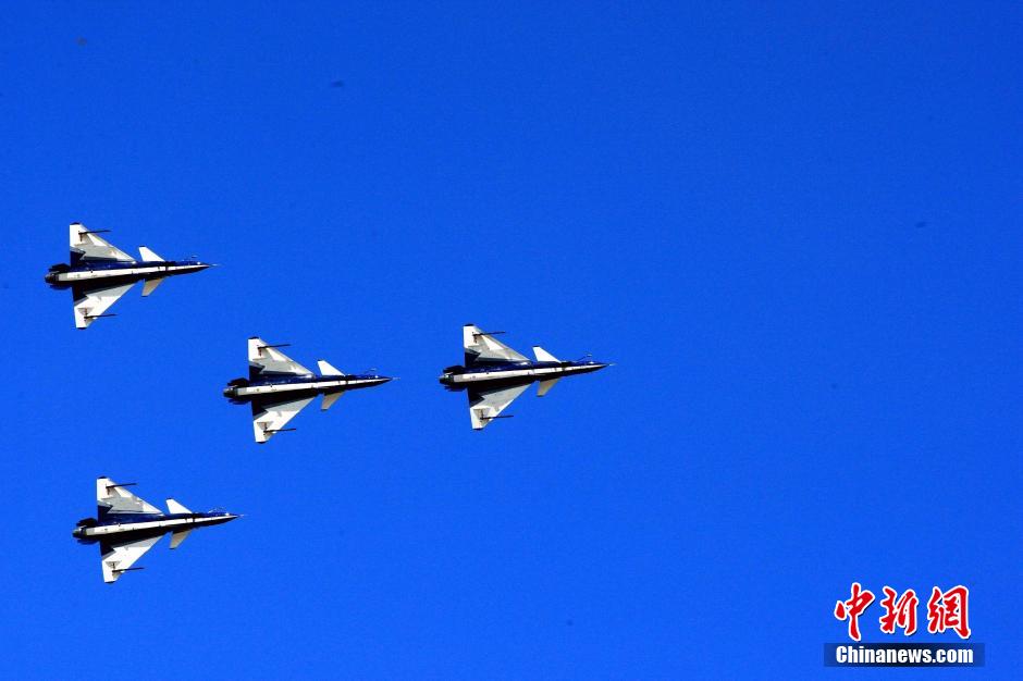 9月10日,空军组织的航空开放活动中,飞行表演备受瞩目。此次飞行表演由三支飞行表演队参加。其中,空军八一飞行表演队、“天之翼”飞行表演队部分队员刚圆满完成纪念抗战胜利70周年阅兵任务归建。图为“八一”飞行表演队四机编队飞行。中新社发 刘成 摄