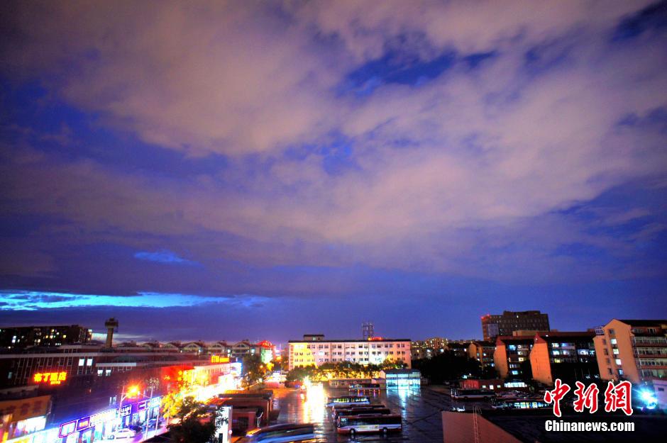 9月11日,北京四季青桥。傍晚时分,京城突然大雨倾盆。雨后夜空湛蓝迷人。中新社发 樊甲山 摄