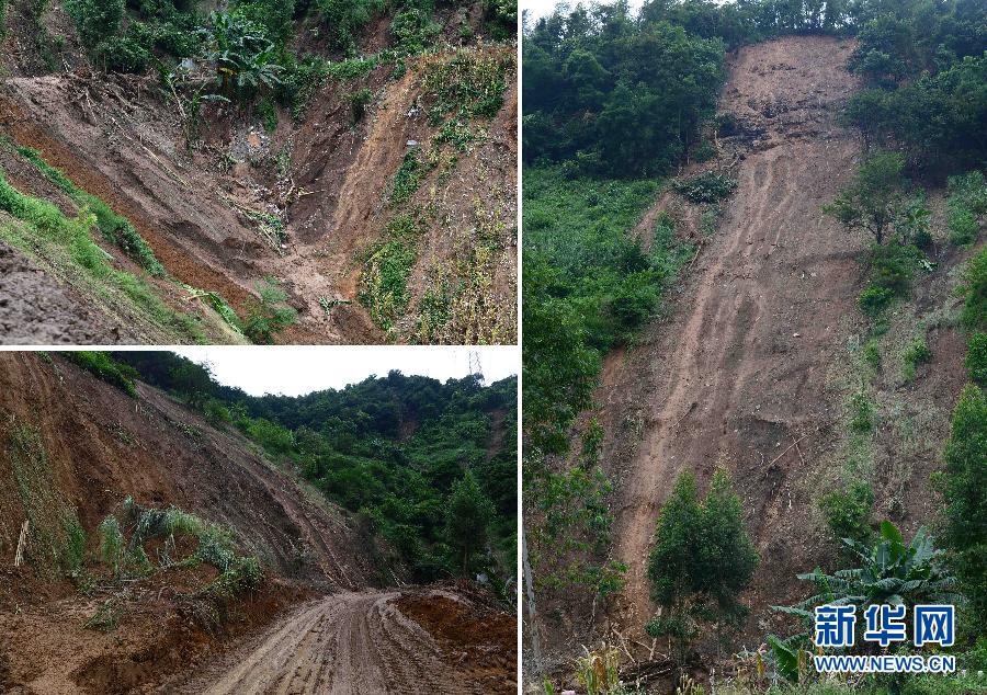 拼版图:左上图是广西百色市右江区阳圩镇达江村一处塌方的溪沟(9月13日摄);左下图是广西百色市右江区阳圩镇达江村一处塌方的路段(9月13日摄);右图是广西百色市右江区阳圩镇达江村一处塌方的山坡(9月13日摄)。当日凌晨,广西百色市右江区遭遇大暴雨袭击。据百色市右江区气象局消息,最大降雨量达217毫米。暴雨导致多个乡镇山洪暴发,部分沿河农田受淹、被毁,尤其是阳圩镇达江片区的达江、布林、孟沙等9个行政村,因大暴雨袭击造成各条乡村公路多处塌方、交通中断,多个村庄停电断水,洪泥冲入民房等。暴雨过后,当地政府和有关部门立即组织力量投入抢险救灾工作,受灾群众也积极开展生产生活自救。新华社发(韦万忠 摄)