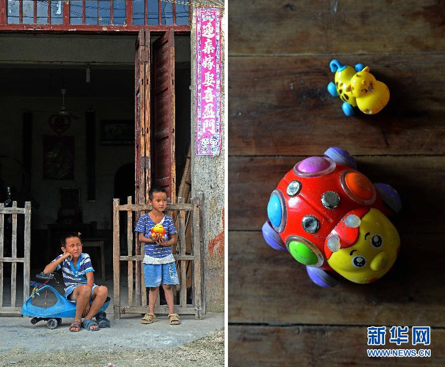 拼版照片:7月30日,沈浪(左)和沈涛在家门口遥望远方(左图),妈妈丁冬菊为孩子们买的玩具(右图)。8岁的沈浪和7岁的沈涛是江西省修水县路口乡仙桥小学学生。兄弟俩的父母在广东汕头打工,父亲做建筑工,母亲打杂工,每年会回一趟家,一年会寄5000多块钱回家。奶奶胡杏花一手把小哥俩拉扯大。 “我不要花衣服,也不要好吃的,我只要和爸爸妈妈在一起。”这是很多留守儿童的心声。为了改善家庭条件,众多务工人员离开家乡远去打工。很多孩子们也因缺乏父母关爱而变得孤独,许多儿童只能通过父母留下的几件礼物来寄托思念。新华社记者万象摄
