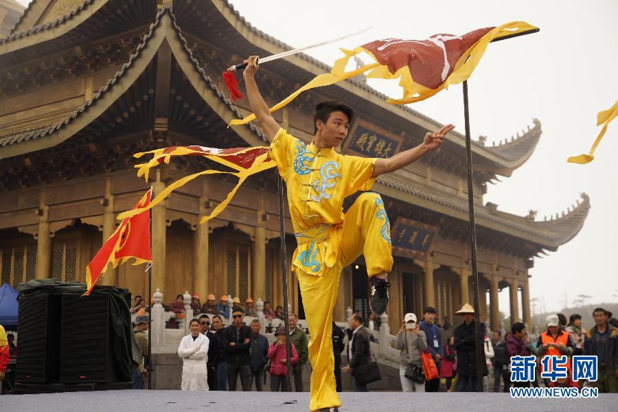 9月15日,参赛选手在峨眉山金顶参加器械比赛。当日,作为第五届四川国际峨眉武术节的一项重要内容,“金顶论剑”峨眉功夫王比赛在峨眉山金顶举行,10名选手参加自选拳术和自选器械的比赛。新华社发(黎涛 摄)
