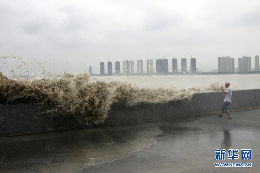 9月15日,农历八月初三,为传统钱江潮大潮汛,在钱塘江杭州下沙七格段,钱江大潮掀起巨浪。 新华社发(魏炜 摄)