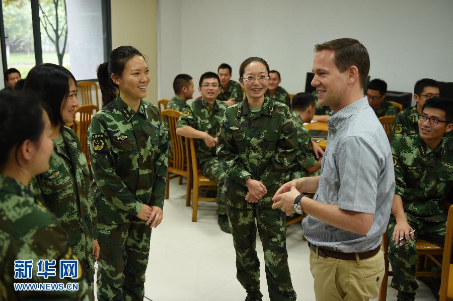 9月15日,维和警察防暴队女队员在口语训练课上与外籍教师交流。由浙江边防总队单独组建的中国第四支赴利比里亚维和警察防暴队目前正在浙江边防总队训练基地集中训练。为期4个月的集训重点突出基础体能、口语水平、维和常识、反恐技能等课程,为2016年代表中国前往利比里亚执行维和任务做充分准备。新华社记者黄宗治摄