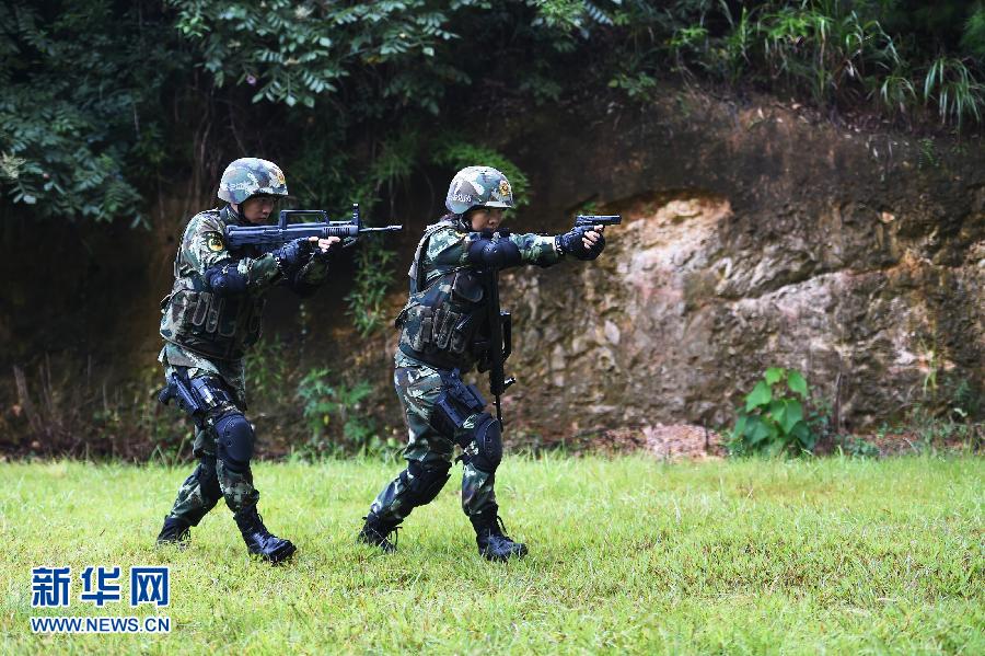 9月15日,维和警察防暴队女队员陈姣姣(右)在反恐技能训练中接近目标。由浙江边防总队单独组建的中国第四支赴利比里亚维和警察防暴队目前正在浙江边防总队训练基地集中训练。为期4个月的集训重点突出基础体能、口语水平、维和常识、反恐技能等课程,为2016年代表中国前往利比里亚执行维和任务做充分准备。新华社记者黄宗治摄