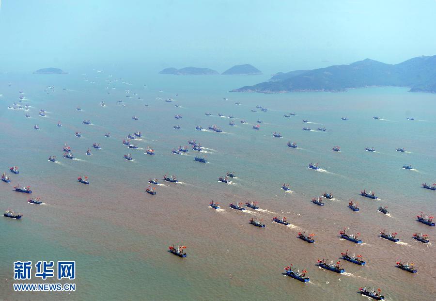 当日,为期3个半月的东海伏季休渔结束,众多渔船劈波斩浪,开往渔场。 新华社发(华志波 摄)