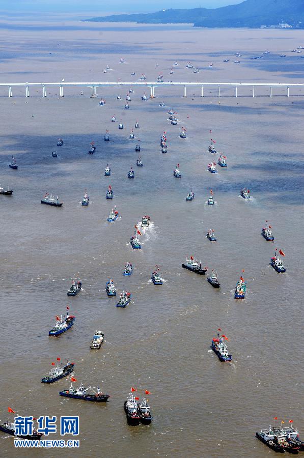 9月16日,浙江省舟山市沈家门渔港的渔船出港经过朱家尖大桥开赴渔场。