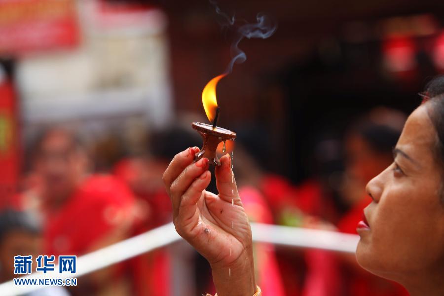 9月16日,在尼泊尔首都加德满都举行的提吉节活动上,一名妇女在祈祷。提吉节又叫女人节,共持续三天。在提吉节上,已婚妇女会禁食并为丈夫祈祷健康和长寿,未婚女子则祈祷嫁给健康英俊的男子。新华社发(苏尼尔·夏尔马摄)