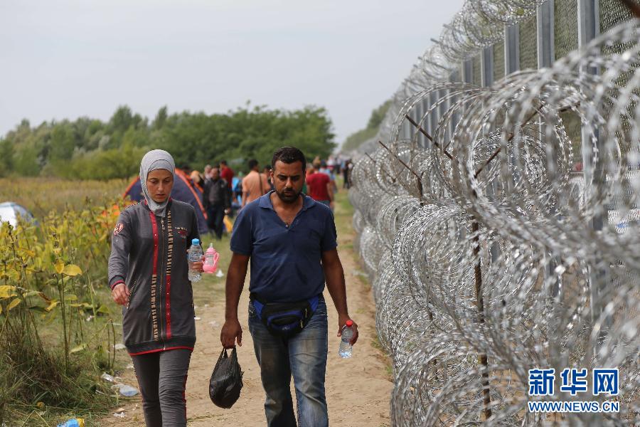 9月16日,在塞尔维亚紧邻匈牙利的边境地区霍尔戈什,难民经过匈塞边境的铁丝网围墙。