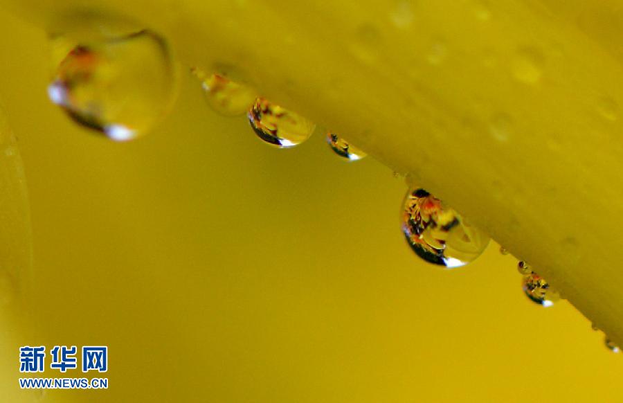 9月17日,在内蒙古呼和浩特市阿尔泰游乐场,菊花花瓣上晶莹的雨滴映射出一抹漂亮的秋色。 新华社发(王正 摄)