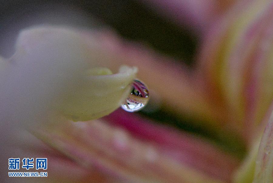 9月17日,在内蒙古呼和浩特市阿尔泰游乐场,菊花花瓣上晶莹的雨滴映射出一抹漂亮的秋色。 新华社发(王正 摄)