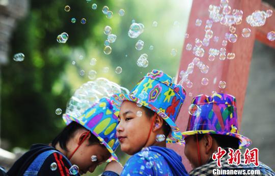 图为三名孩童头戴泡泡魔术帽。 杨艳敏 摄