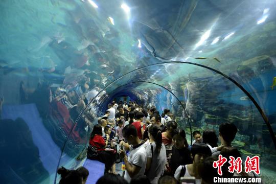 10月4日,国庆黄金周期间,福州罗源湾海洋世界人山人海。海洋世界占地172亩,建筑面积2万余平方米,设有70多个海洋生物展示设施,展示海洋动植物300多种,是亚洲地区规模超大、海洋物种展示丰富、展示功能设施齐全的综合场馆。