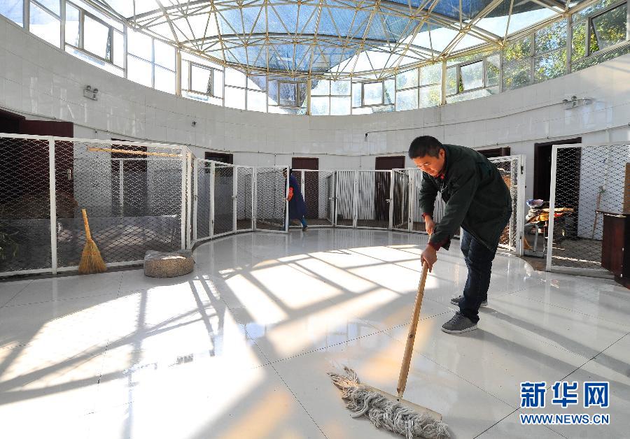 饲养员李喜贵在打扫卫生(10月3日摄)。新华社记者 许畅 摄