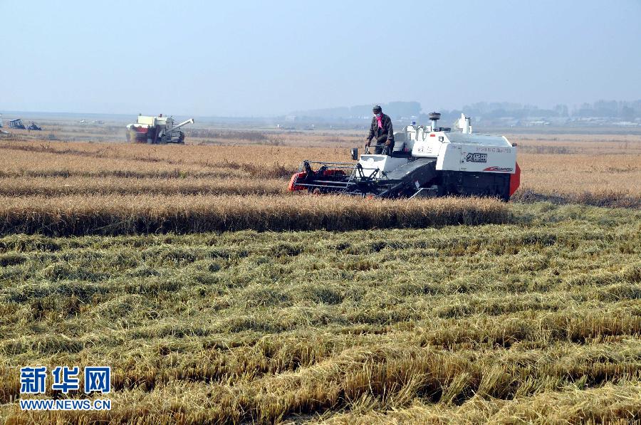 10月6日,位于黑龙江省北安市的黑龙江垦区建设农场水稻管理区种植户在田间收获水稻。当前,黑龙江垦区水稻、玉米、大豆正处于收获期,各农场种植户利用晴好天气,组织机械力量加紧收割,确保颗粒归仓,高质量完成秋收生产。新华社发(周良君 摄)